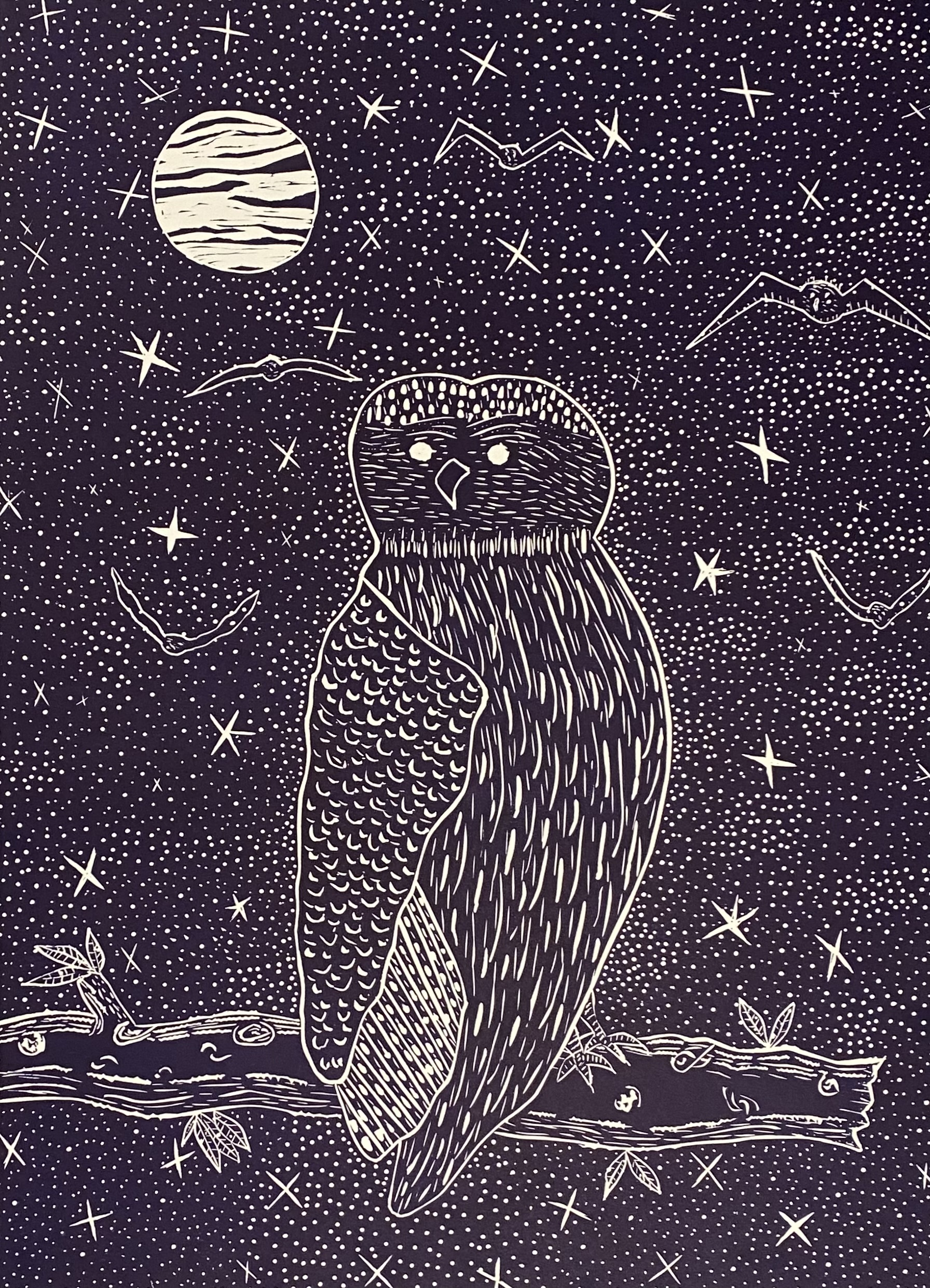 ‘At night the owl sits on a branch watching for it’s prey.’ – Karen Rogers Linocut print on 300GSM Hahnemuhle paper. This is a bleed print, that is the image area runs to the edge of the paper. There is no white paper border making it perfect to float mount/box frame. The print is signed and numbered on the back.