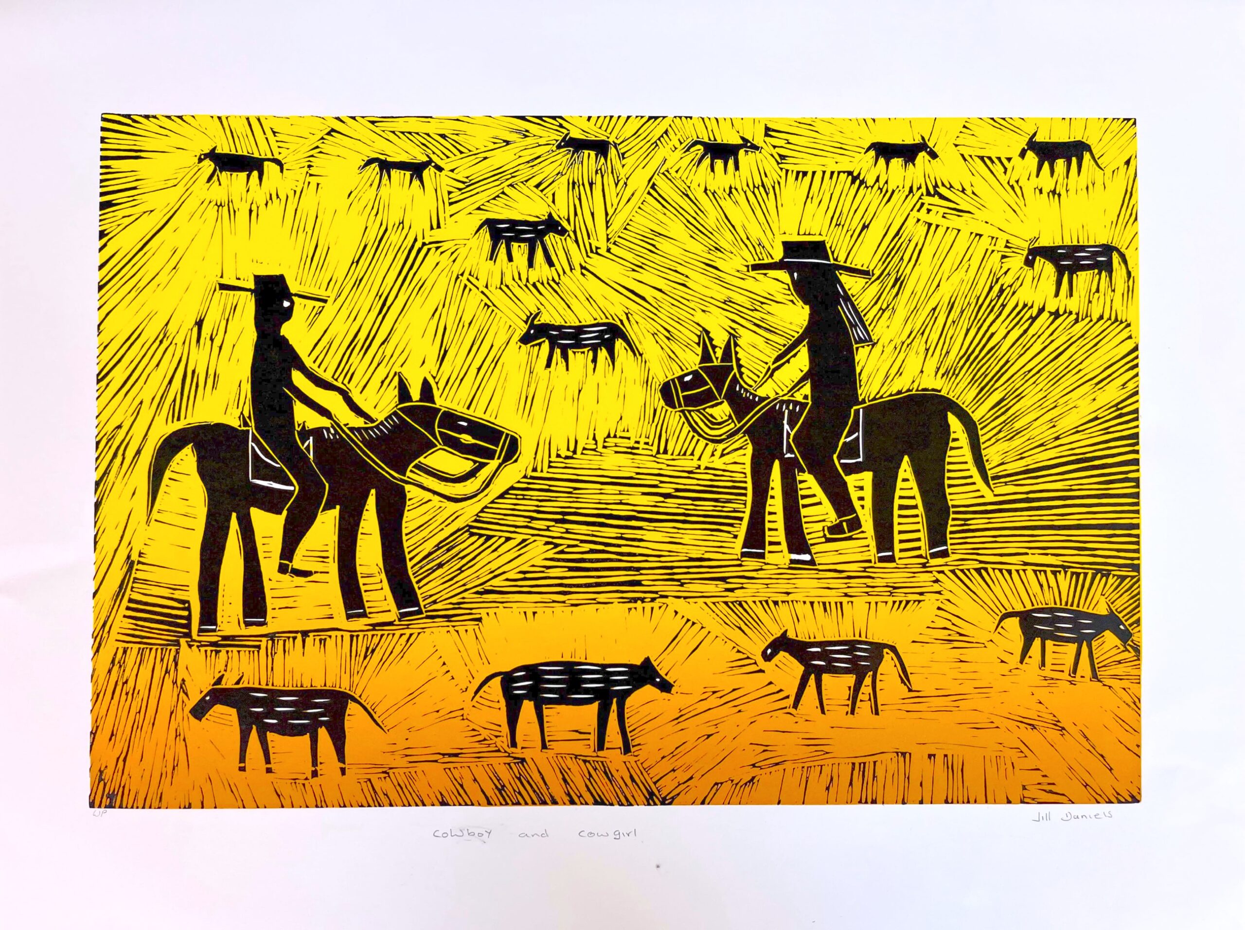 Kauboi en kugel dubala wotjimbat detmob buligi. The cowboy and cowgirl are watching all the cattle.